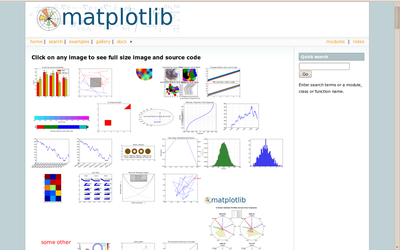 Matplotlib’s website http://matplotlib.org/ features a very nice gallery with a large number of plots, each of them shows both the source code and the resulting plot. This is very useful for learning by example. More standard documentation is also available.